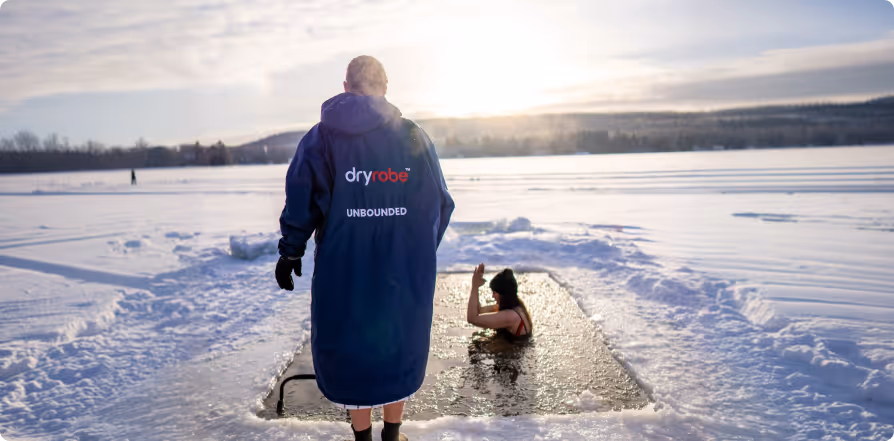 Lisa: Participants drop their robes, enter the water for 2–3 minutes of guided immersion, and when they step out, that "hero" moment happens. They’re shivering, they’re euphoric, they dive back into their Dryrobes and begin to move their body. Once the Dryrobe is on people often feel comfortable to linger and watch the sunrise. We then move into a wood-fired sauna, but that transition period between the ice and the heat is where the Dryrobe is essential.